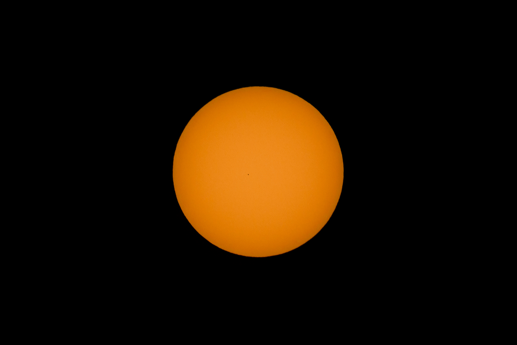 I look through old images from time to time. I took this Nov. 11, 2019 with the film filter on the 100-400mm lens/5D Mark III. The only way you can tell this is in focus is the tiny dot near the center of the Sun, which is the planet Mercury transiting. I tried my new Photoshop tricks to get more texture on the surface, and nothing. I can only imagine that the lens film filter doesn't pass those details like the lens glass filter or the telescope filter do. It's my practice lately not to upsize solar and lunar images if they are smaller than 1200x1800 pixels, so this disk is smaller than the first one. Obviously I didn't use the teleconverter that day.